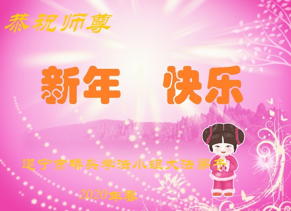 我们遂宁市一家大法弟子及家人,恭祝师父新年快乐!感恩师尊一年来对我们大法弟子及家人的无量慈悲救度和保护!感恩师尊为我们的无量承受和巨大付出。正法洪势一年年走到今天,我们大法弟子在越来越成熟,众生在一年年逐渐醒悟,此全是师尊无量慈悲洪大法力的展现。 在今后新的一年里,无论有多大险难,无论时日长短,我们都将继续紧跟师尊正法進程,努力做好师尊教诲的三件大事,向内找,修去自己的人心和执着,救度更多众生,完成自己的历史使命,圆满跟师父回家! 四川遂宁市一家大法弟子及家人拜贺 二零二零年元月十一日 四川遂宁市桥头学法小组大法弟子恭祝师尊新年快乐!