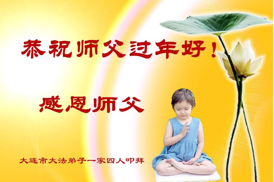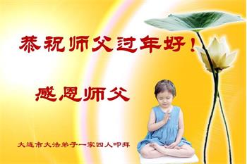 辽宁省大连大法弟子及家属一家四人恭祝师父过年好!