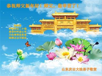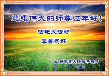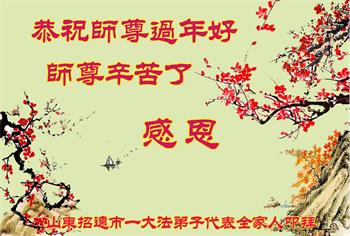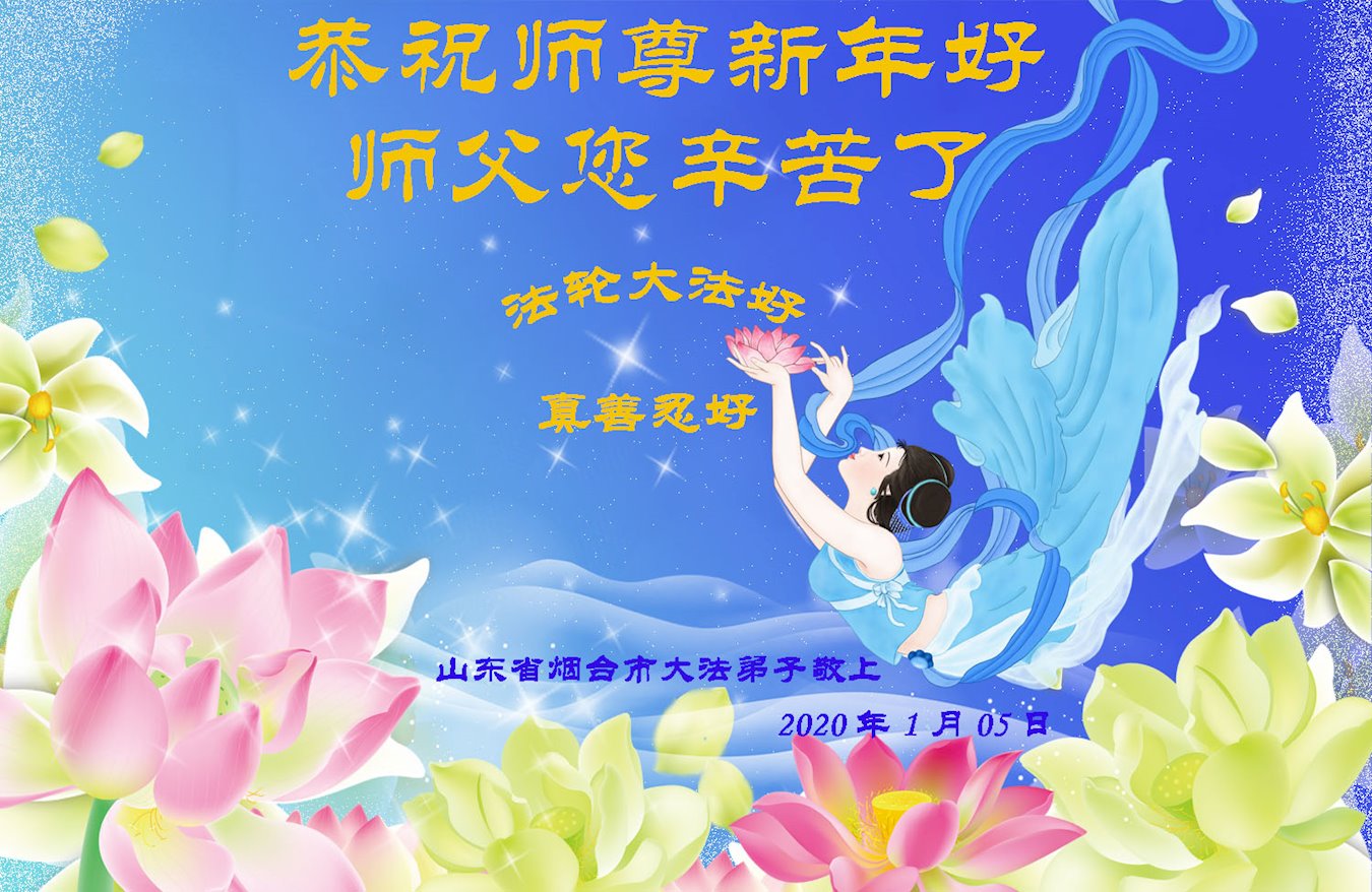 师尊,新年好! 2020年已经来到,弟子随师修炼已经走过了二十三个春秋。在这风风风雨雨的岁月中,从个人修炼时期到正法时期,弟子能感受到师尊的保护和加持,师父,您辛苦了。二十多年来,弟子虽然有时懈怠,但无论邪恶如何疯狂,一直走在修炼的路上,从没迷茫。 新的一年,弟子将好好学法、修好自己,修去执着,并和同修们一起,互相配合好,助师正法,更多的救度众生,不负师尊的慈悲苦度。 山东烟台招远市一大法弟子代表全家人恭祝师尊过年好!