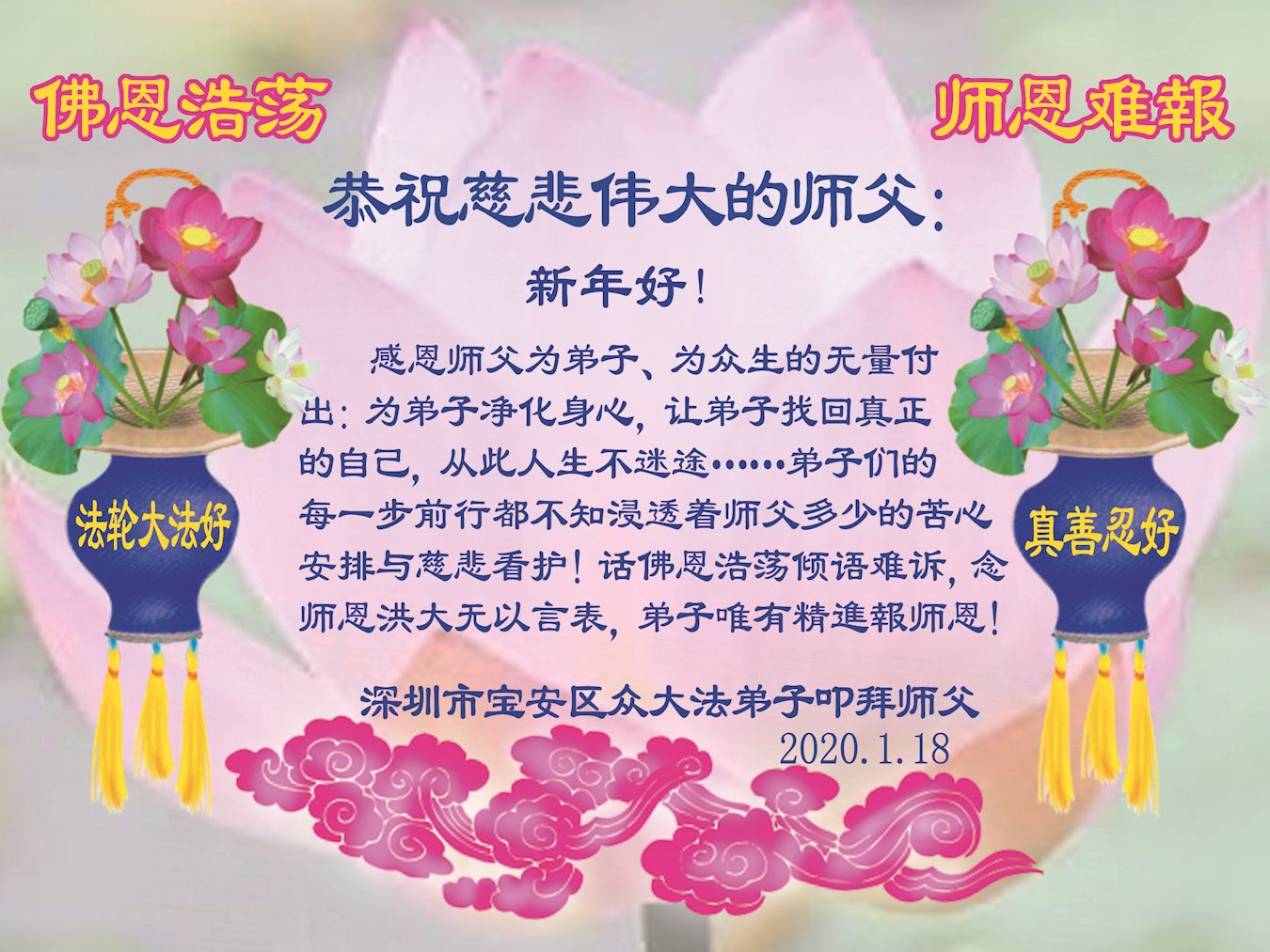 慈悲伟大的师尊新年好! 在师尊的慈悲保护下,弟子又度过了平安的一年。自弟子修炼二十多年来,即使在风雨飘摇中,在如泰山压顶的压力中,始终感受到师尊无时无刻的点悟和保护,得以平安度过了一年又一年。弟子能在法中有所升华,离不开师尊无时无刻的看护和苦度,就如学步的孩子始终在父母的看护下一样,即使摔倒,爬起来再走,一次又一次,直到自己能稳健起来。因为有师尊,弟子始终觉的自己就是最幸福的人之一。借恭贺新年之际,弟子再次向师尊跪拜合十,叩谢师尊无量洪恩! 广东省佛山市南海区一大法弟子敬上 2020年1月13日 广东省深圳一大法弟子及家人恭祝师父新年好!