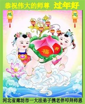 河北省廊坊市一大法弟子携老伴叩拜敬上 河北省廊坊市一大法弟子恭祝慈悲伟大的师尊过年好!