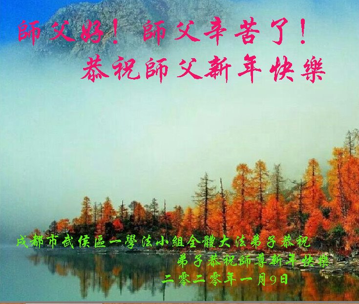 谢谢师尊对弟子及全家人的慈悲苦度! 弟子一定在新的一年里做好师尊要求的三件事,请师尊放心。 四川省成都市武侯区一学法小组大法弟子恭祝师尊新年快乐!