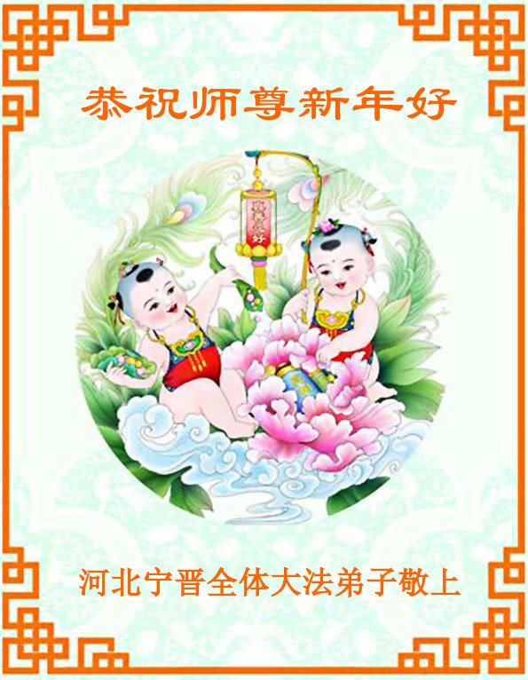 河北衡水西郊一夫妇大法弟子敬上 法轮大法传世界 轮回几生到人间 大苦大难为得法 法度有缘幸运者 好好修炼回家园 真心助师救众生 善待众生永救度 忍让他人真高兴 好好走正大法路 远离轮回随师还 精進实修圆满回家园 河北省沧州黄骅市全体大法弟子恭祝师尊新年快乐!