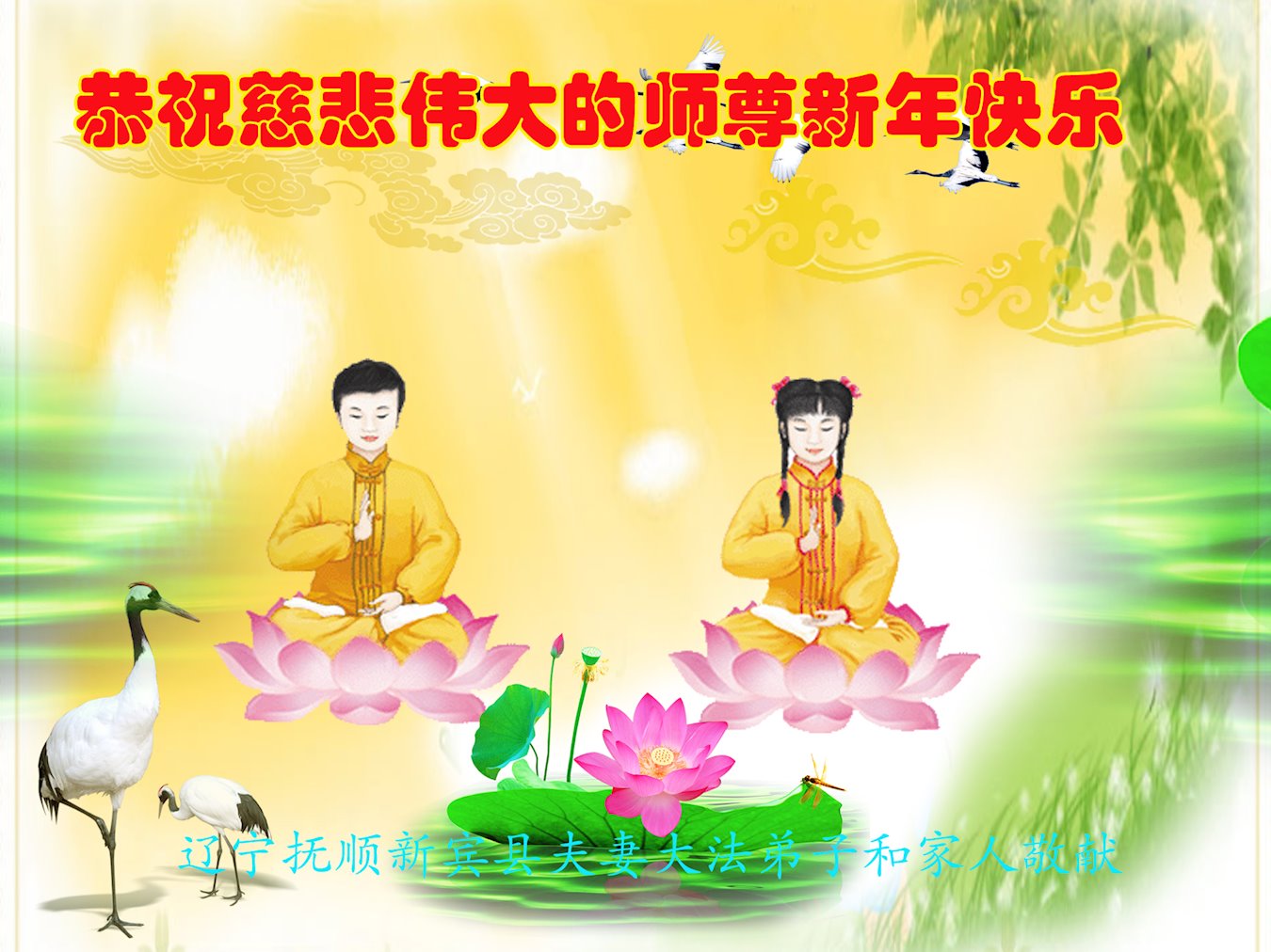 恭祝师尊新年快乐!法轮大法好!真善忍好! 跪拜 叩首 辽宁铁岭调兵山一学法小组大法弟子恭祝师尊新年好!
