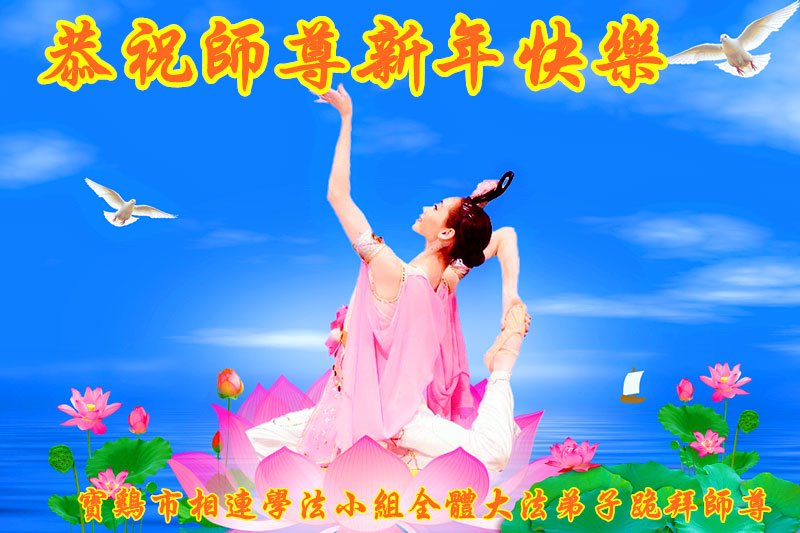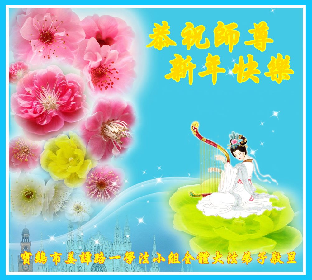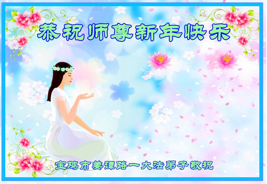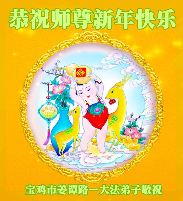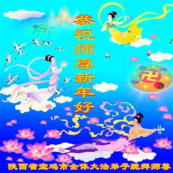 师父新年好!师父辛苦了!我们宝鸡市全体大法弟子远隔千里叩谢师尊的救度之恩!弟子们一定抓紧时间做好三件事,消除间隔,珍惜同修缘,形成整体,共同精進,让师父少一份操劳,多一份欣慰! 宝鸡市全体大法弟子叩拜师尊! 陕西省宝鸡市渭滨区全体大法弟子恭祝慈悲伟大的师尊新年快乐!