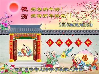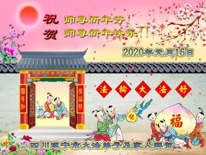 值此2020年中国新年来临,辞旧迎新之际,我们遂宁市大法弟子及家人,恭祝慈悲伟大的师尊新年好!师尊新年快乐!感恩师尊对我们大法弟子及家人的无量慈悲救度和保护!感恩师尊为我们的巨大承受和付出! 正法洪势一年年走到今天,我们大法弟子越来越成熟,众生在一年年逐渐醒悟,救度的众生越来越多!此全是师尊无量慈悲洪大法力的展现!佛法无边! 在新的一年里,无论前路有多远,无论时日多长短,无论有多少艰难险阻,我们将紧随师尊,跟上正法進程,努力做好师尊教诲的三件事。认真向内找修去自己的一切人心和执着,救度更多的众生,完成大法弟子的使命,圆满随师还! 庚子鼠年感怀 转眼正法又一年,大穹苍宇展新颜。 大法弟子不畏苦,乐在苦中福音传。 救度众生遵师训,寒天酷暑不等闲。 千家万户长梦醒,万户千家结圣缘。 流氓小丑妖戏尽,苍宇众生满法船。 惟我师尊少分忧,法徒奔波不计年。 再苦再累心甜美,愿我师尊笑开颜。 随师正法了洪愿,誓完使命随师还! 四川遂宁大法弟子敬上 2020年元月16日。 四川省凉山州会理县修炼之家大法弟子遥祝师尊新年快乐!