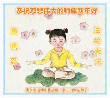 山东省淄博市张店区一家三口大法弟子恭祝慈悲伟大的师尊新年快乐!