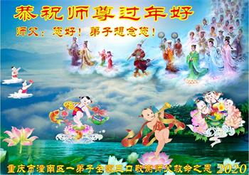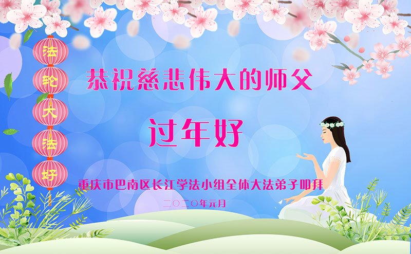 重庆市江北区一学法小组全体大法弟子: 恭祝慈悲伟大的师尊过年好! 在新的一年里我们继续做到: 新年新开端 学法修心性 实修去执着 遇事向内找 做好三件事 精進永不怠 他日大圆满 随师回家园 重庆市江北区一学法小组全体大法弟子敬上。 二零二零年元月十六日 重庆市长寿区一大法弟子恭祝师父过年好!