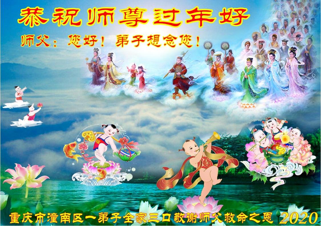 慈悲伟大的师尊好!师尊辛苦了! 每逢佳节倍思亲,在传统的中国新年佳节来临时,弟子们格外想念师尊。我们重庆市沙坪坝区十人学法小组全体弟子给师父拜年了!恭祝慈悲伟大的师尊新年快乐! 此时此刻,我们内心充满了对师父的感恩,感谢师尊的慈悲苦度!感谢师尊的浩荡佛恩!千言万语说不尽谢意,道不清对师尊的感恩。只有遵照师尊的教诲,多学法,学好法,努力修好自己,做好三件事,救度更多众生,以报答师尊,努力达到师父的要求,达到大法对弟子的要求,圆满功成,跟师父回家! 恭祝师尊庚子新年快乐! 重庆市沙坪坝区十人学法小组全体弟子叩拜 庚子新年 重庆市潼南区一弟子全家三口恭祝师父过年好!谢师父救命之恩!