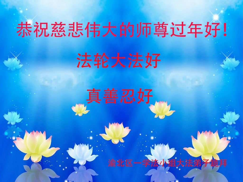 渝北区一学法小组大法弟子怀着无限敬仰的心情给师父拜年!恭祝慈悲伟大的师尊过年好!师父辛苦了!弟子感恩师父! 在新一年里,我们要更加努力地做好三件事,学好法,修好自己,多讲真相多救人,跟上正法進程,不负师恩。 谢谢师父的慈悲苦度! 重庆一学法小组全体大法弟子恭祝师尊新年快乐!