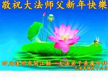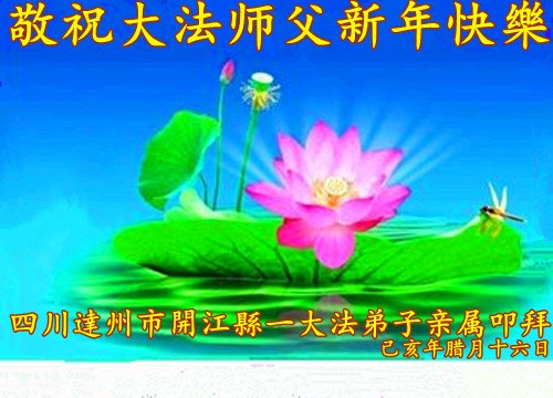 恭祝师尊新年快乐! 我和女儿及家人感谢师父的救命之恩,我们用尽语言也无法表达对师父慈悲苦度的感恩。弟子虽然还有很多地方没有做好,但请师父放心,我们会用大法来归正自己、修好自己,做好三件事,跟师父回家。 四川省德阳市母女俩大法弟子携家人敬祝 四川德阳广汉一大法弟子及全家祝师父新年快乐!