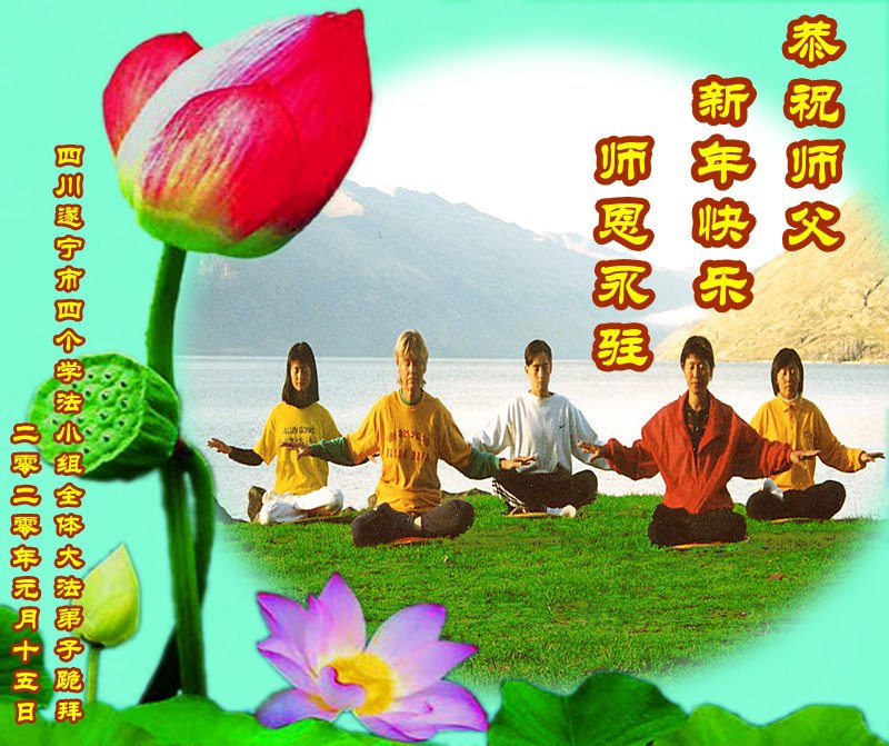师父您辛苦了!感恩师父一年来的慈悲救度,慈悲加持,慈悲点化!千言万语汇成一句话:恭祝师尊新年快乐! 在新的一年里,我们会更加精進,努力做好师尊教诲的三件事,多学法,学好法,遇事向内找,修好自己,多多救人,完成自己的大愿,让师尊多一份欣慰,少一份操劳! 再次感恩慈悲伟大的师尊! 四川遂宁四个学法小组全体大法弟子:恭祝慈悲伟大的师父新年快乐!师恩永驻!