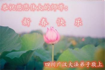 慈悲伟大的师尊:新年好! 跟头把式跟随您走到今天的弟子,无以言表师尊对弟子所给予的一切,在这团圆的日子,广汉法轮大法弟子想念您。 弟子叩拜师尊!祝您新年快乐!弟子一定精進不停,兑现史前誓约,圆满随师还。 四川德阳市广汉一学法小组全体大法弟子 四川省德阳市母女俩大法弟子恭祝师尊新年快乐!