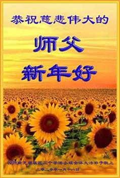 新年来临之际,弟子们问候师父为救度众生辛苦了!恭祝师父新年好! 感谢师父对弟子的慈悲救度!在师父正法最后时刻,弟子们一定努力学好法,修好自己,在新的一年里更精進,努力完成使命,不负师父期望。 四川一位大法弟子恭祝师父新年好!