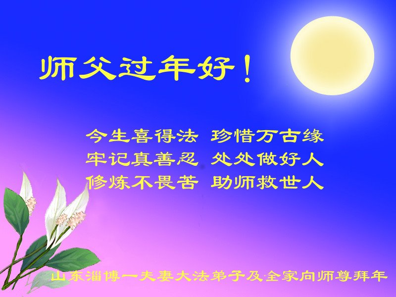 恭祝慈悲伟大的师尊过年好!师尊您辛苦了!千言万语也无法表达弟子对您的感恩!弟子一定要勇猛精進,用法严格要求自己,做好三件事,跟上正法進程,对的起师父的慈悲苦度,对的起众生。 山东淄博一夫妻大法弟子及全家恭祝慈悲伟大的师尊过年好!