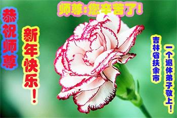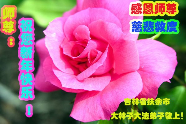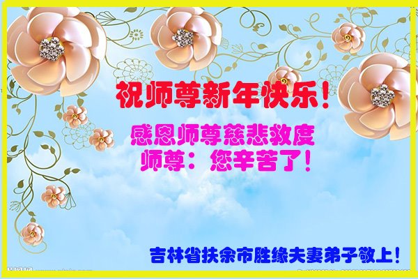 师尊:感谢您将宇宙的大法传与弟子!感谢您将弟子从地狱中捞起洗净!感恩您为弟子承受罪业!感恩您一路保护!感恩您对弟子的慈悲救度! 师尊:您辛苦了!弟子叩谢师尊!弟子一定听您的话,提高心性,遇到矛盾向内找,坚修大法到底!做好三件事,圆满随师还! 吉林省扶余市一大法弟子叩拜师尊 吉林省扶余市全体大法弟子恭祝慈悲伟大的师尊过年好!