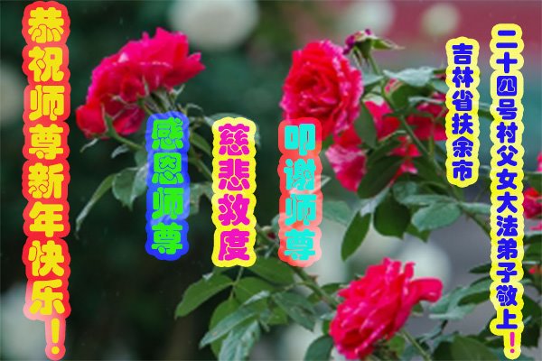 吉林省白山市抚松县全体大法弟子恭祝师父新年快乐! 在此新年之际,白山市抚松县的全体大法弟子,恭祝慈悲伟大的师尊二零二零年新年快乐!感恩师父的慈悲苦度! 法轮大法从中国弘扬到海外一百多个国家和地区,师父为弟子们付出了太多的心血,海内外的世人都承蒙着师尊的佛恩浩荡,与师在与法在的日子里弟子是多么的幸福,虽然中国大陆的迫害还在继续,但是我们一定会做好三件事,等师父回来! 吉林省白山市抚松县全体大法弟子合十敬上 吉林省扶余市一大法弟子恭祝慈悲伟大的师尊过年好!