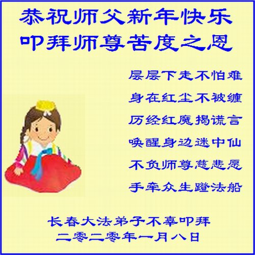 恭祝师尊新年快乐! 层层下走不怕难 身在红尘不被缠 历经红魔揭谎言 唤醒身边迷中仙 不负师尊慈悲愿 手牵众生蹬法船 长春大法弟子叩拜师尊苦度之恩 二零二零年一月八日 吉林省长春市大法弟子恭祝慈悲伟大的师尊新年快乐!