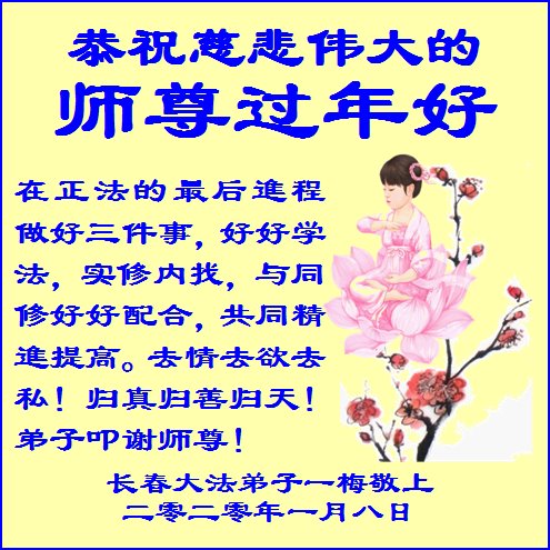 恭祝师尊新年快乐! 再去执着,多救人。 长春大法弟子敬上 二零二零年一月八日 吉林省长春市大法弟子恭祝慈悲伟大的师尊过年好!