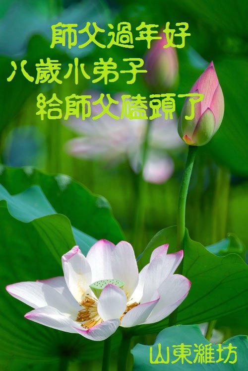 山东省潍坊市寒亭区一大法弟子携大法小弟子恭祝慈悲伟大的师尊新年快乐!