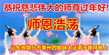 山东省烟台市莱州一名大法弟子恭祝慈悲伟大的师尊过年好! 山东省烟台市莱州一学法小组四姐妹大法弟子恭祝慈悲伟大的师尊过年好!