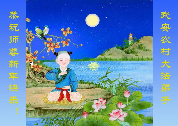 盼师尊早日回神州大地。 山东青岛平度乡村一位大法弟子恭祝慈悲伟大的师尊新年快乐!
