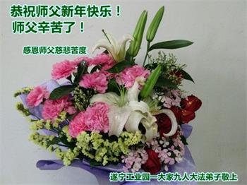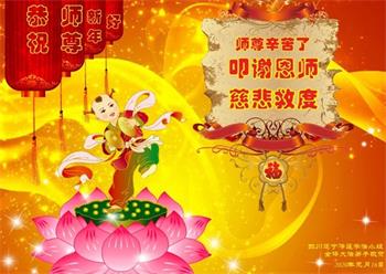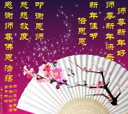 二十多年前,在病魔缠身的痛苦时刻,有幸走入法轮大法修炼,短短几十天,身体上的病魔全部消失。二十多年的修炼,法轮大法的“真善忍”法理让我懂得了做人的目地,让我明白了人生的意义。二十多年来,走在正法的路上,是师父一路的慈悲保护、点化,让我更加的坚定的走到今天。千言万语无法表达对师父的感恩,弟子一定会坚定的走好今后的修炼路,完成自己的使命,跟师父回家。 四川遂宁学法小组全体大法弟子叩拜恩师新年好!