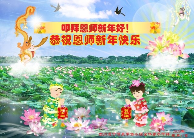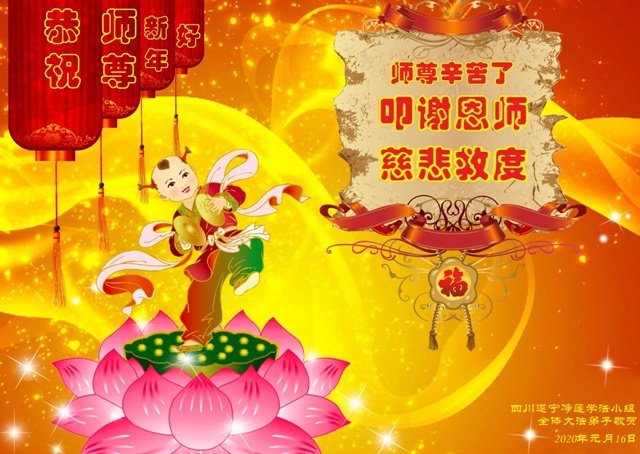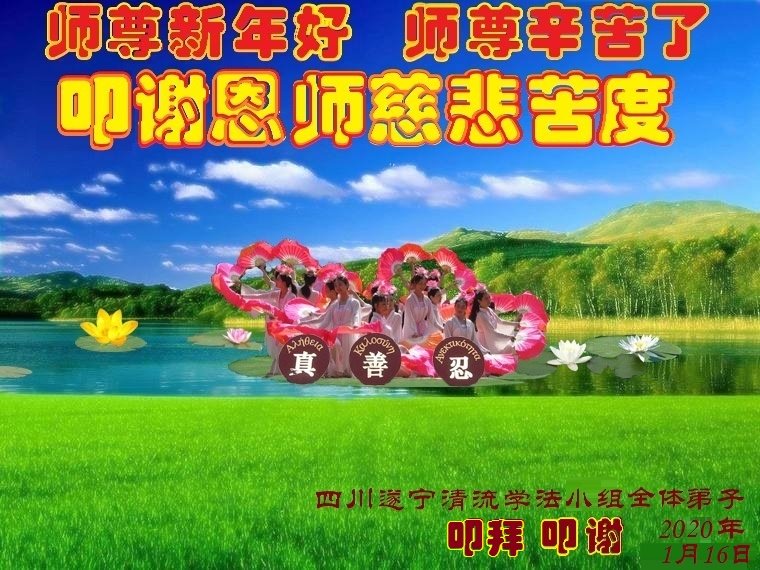 师尊新年好!师尊辛苦了!叩谢恩师慈悲苦度!每到新年佳节,倍感恩师洪恩,也是弟子回忆一年修炼历程,对照大法,对照师训,找差距,紧跟师尊正法進程的时刻。正法已到最后时刻,弟子一定遵师教诲,修炼如初,勇猛精進,走好走完师尊正法的最后進程,圆满跟随师尊回家。弟子再次叩谢师恩。 四川遂宁净莲学法小组全体大法弟子敬贺师尊新年好! 2020年元月16日 四川遂宁学法小组全体大法弟子叩拜恩师新年好!
