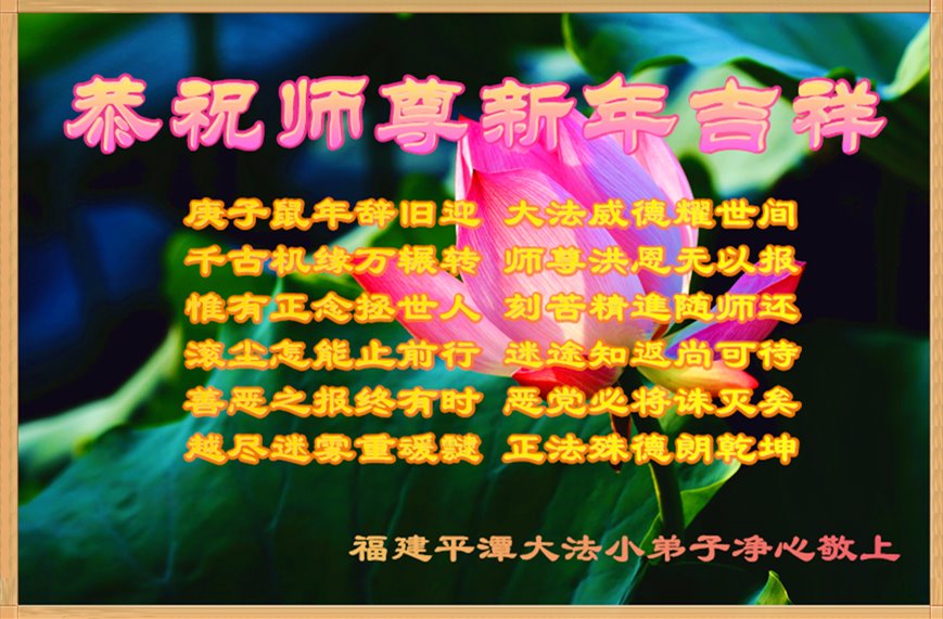 庚子鼠年辞旧迎 大法威德耀世间 千古机缘万辗转 师尊洪恩无以报 唯有正念拯世人 刻苦精進随师还 滚尘怎能止前行 迷途知返尚可待 善恶之报终有时 恶党必将诛灭矣 越尽迷雾重叆叇 正法殊德朗乾坤 向师尊表以最真诚的祝愿! 弟子希望尽快纠正自己不正确的状态,努力精進兑现史前的洪愿! 吉林省延边州大法小弟子恭祝师尊新年快乐!