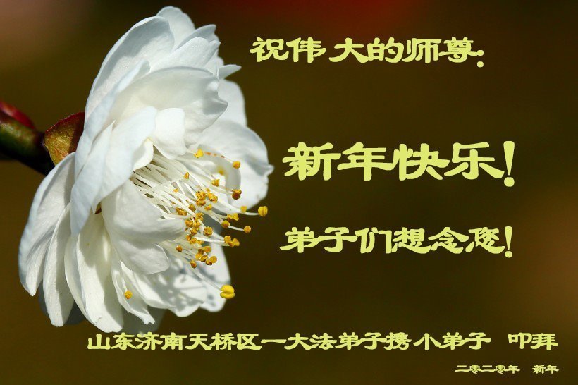 恭祝师尊新年快乐! 师父辛苦了!师父辛苦了! 谢谢师父!谢谢师父! 在邪恶疯狂迫害大法、大法弟子这二十年的艰苦岁月中,伟大的师父为弟子无尽的承受与付出,无时无刻的保护下使弟子平稳的走过了这血雨腥风的二十年。弟子一定珍惜这最后的宝贵时间,修好自己多救人,随师父回家。 再祝师尊新年快乐!谢谢师父! 四川成都市南门老年弟子携小弟子向慈悲伟大的师父合十 叩首 二零二零年一月十六日敬上 山东省威海市荣成市一年轻大法弟子携小弟子及家人给您拜年了,恭祝师尊新年快乐!