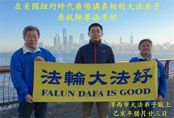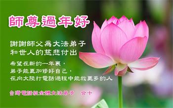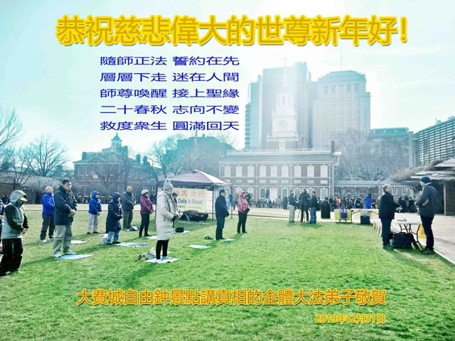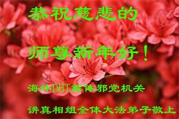 | 【明慧网二零二零年一月二十四日】法轮大法洪传一百多个国家和地区,世界各国大法弟子走在修心向善、返本归真的大道上,同时慈悲的向各国民众弘扬大法、讲清真相、反对中共迫害。法轮大法真相在世界各国政府、媒体、民众中越来越广为人知。 多年来坚守在景点、媒体、影视、社区弘法、网络、真相电话等各个项目中的大法弟子们深知自己的使命,感谢师尊给予弟子救度众生的荣耀。在中国传统大年来临之际,世界各地大法弟子恭祝师尊新年好! 全球电话组DHT平台一小组全体大法弟子恭祝师尊新年好!恭祝慈悲伟大的师尊新年好! 我们历经万般险难来到世间,终于庆幸接上这万古不遇的法缘!这二十年风雨中,在您的看护下,我们无畏的走过来了,是慈悲的您把满身业力的我们洗净,千言万语也难表达对您的无尽感恩。 师父啊!我们不会忘记史前立下的誓约,弟子们在新的一年里会更精進做好三件事,将真相传遍人间,让更多众生能得救,给师父交一份满意的答卷。 全球电话组DHT平台一小组全体大法弟子合十叩拜 台湾电话组全体大法弟子恭祝师尊过年好!海外DHT一讲真相组大法弟子恭祝慈悲伟大的师尊新年好!我们是海外一个讲真相小组的大法弟子,大法的圣缘让我们相聚在一起,每个人入道得法时间不同,修炼状态不同,在师尊无微不至的保护下,坚定不移的跟随师尊一路走了过来。师尊将我们从地狱中捞起洗净,用博大精深的法理唤醒我们沉睡的心灵,引领我们走上新的历程,走在神的路上。我们深知是师尊无量的承受为弟子们开拓了修炼的路,是师尊无量的慈悲成就了弟子们辉煌的未来! 在新的一年里,我们唯有多学法精進实修,救度更多的众生,才能报答师父的浩荡洪恩! 海外一讲真相组全体大法弟子叩拜 新世纪影视基地大法弟子恭祝师尊过年好!纽约法拉盛图书馆真相点全体大法弟子恭祝师尊新年快乐!大费城自由钟景点讲真相的全体大法弟子恭贺慈悲伟大的师尊新年好!随师正法 誓约在先 层层下走 迷在人间 师尊唤醒 接上圣缘 二十春秋 志向不变 救度众生 圆满回天 希望.之声生活中心健康栏目全体同修恭祝师尊过年好!澳洲悉尼电话组大法弟子恭祝师父新年快乐!美国德州神韵推广小组大法弟子恭祝师父新年快乐!美国圣路易斯老年公寓大法弟子恭祝师尊过年好!爆竹声声辞旧岁, 中华喜迎庚子年。 师尊率徒救众生, 得救世人福寿全。 金色祝福送吉祥, 世人闻听笑开颜。 耄耋古稀和花甲, 三件大事做的全。 踏遍民舍和商圈, 神韵广告随处见。 神韵救人在主流, 社会精英场场满。 平台电话送福音, 久慕信息隔洋传。 电子邮件效率高, 手机电脑信息添。 彩信短信和微信, 海外信息能得见。 破网软件显神通, 白骨解体化青烟。 邪灵阴谋一场空, 中共解体在眼前。 大法弟子再精進, 修炼圆满随师还。 恭贺师尊过年好! 大法永存人世间。 全球营救平台电话组全体大法弟子恭贺慈悲伟大的师尊过年好!谢师恩 佛恩浩荡天宇间 法轮飞旋又一年 法正三界回天力 救度众生有法船 万物乐 佛光普照 人间现 礼义圆明 弟子感恩师尊教 法轮大法是大道 全球.退:党!义工恭祝慈悲伟大的师尊新年好!新年来临之际,全球.退:党!中心代表全球.退:党!义工恭祝慈悲伟大的师尊新年好! 二零二零年一月十四日 新西兰惠灵顿球场炼功点大法弟子恭贺师父过年好!在中国驻新西兰大使馆外讲真相炼功的大法弟子给师父拜年新西兰罗托鲁瓦湖边讲真相大法弟子恭贺师父新年快乐!澳洲一讲真相项目组大法弟子恭祝师尊黄历新年快乐!讲真相项目组全体大法弟子恭祝师尊庚子年黄历新年快乐!弟子一定听师父的话,做好大法弟子应该做的。谢谢师父! 如梦令 神州春归何处 满目疮痍人怒 师尊挽狂澜 法粒子正念出 破网 破网 门开柳暗花舞 韩国真相点一线讲真相的大法弟子恭祝慈悲师尊新年好!新西兰汉密尔顿在旅游点的大法弟子恭祝师尊过年好!纽约天国乐团部份大法弟子恭祝师父过年好!在美国纽约时代广场讲真相的大法弟子恭祝师尊过年好!新泽西大法弟子敬上 韩国汉城波拉美公园炼功点大法弟子恭祝师尊新年快乐!