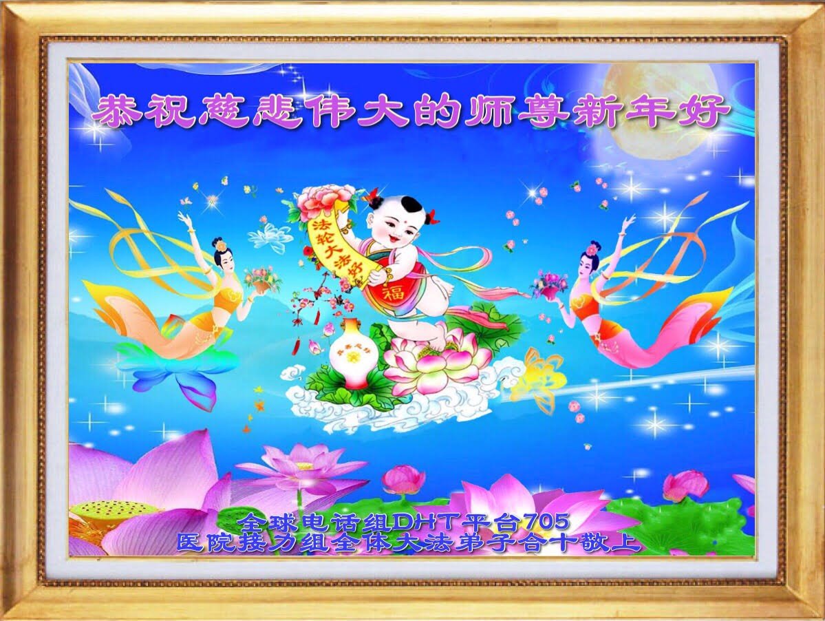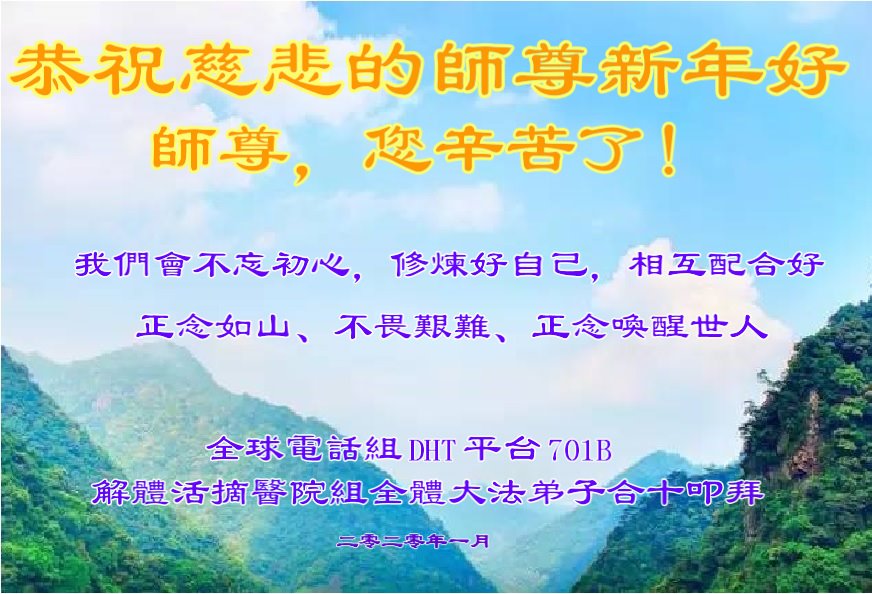 恭祝慈悲伟大的师尊新年好! 师尊,您辛苦了! 我们会修炼如初,修炼好自己,相互配合好 正念如山、不畏艰难、正念唤醒世人 全球电话组DHT平台701B组解体活摘医院组全体大法弟子合十叩拜 全球电话平台DHT手动广播组大法弟子恭祝师父新年快乐!