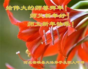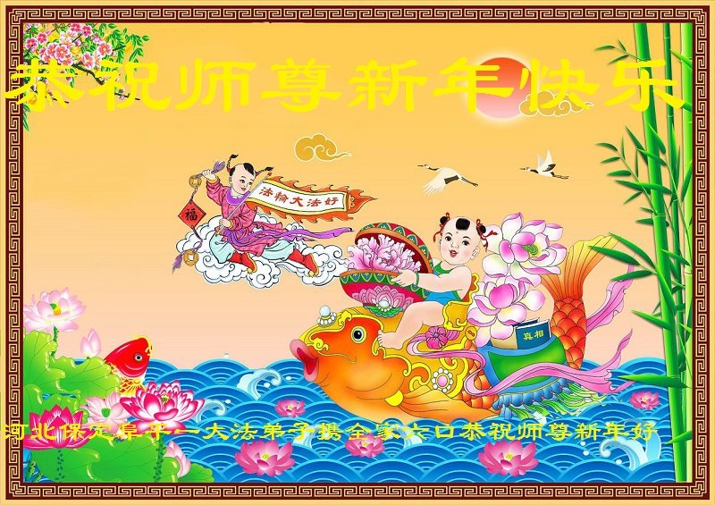 谢师恩 庆新春 过新年 家家户户齐团圆 鞭炮响 烟花灿 男女老少笑开颜 亿万梅 万朵莲 助师正法不得闲 去执着 修吾心 用心做好事三件 愿我师 放宽心 弟子一定兑誓言 除邪恶 揭谎言 大法真相户户传 寰宇清 阴霾散 法徒飞升随师还 河北保定市一家三口大法弟子跪拜恩师! 河北省保定母女大法弟子恭祝师尊新年快乐!