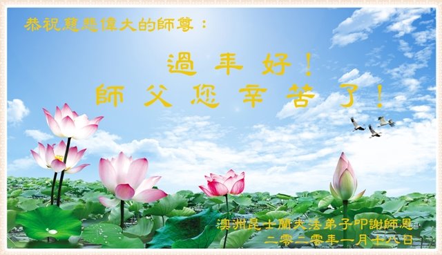 每逢佳节倍思亲,师尊就是我最亲的亲人,至尊的圣主,师尊您辛苦了,弟子跪谢师恩! 您用最浅白的道理为弟子阐释了宇宙的真理、生命的真谛,开启了我生命久远的记忆,指引我踏上了返本归真的道路。 回归路上有了您的慈悲看护,我才得以逢凶化吉、遇难呈祥,神体在熔炉中淬炼,心性在魔难中升华,深信回天不是梦,神路不算远。 请师尊放心,弟子万分珍惜这万古机缘,感念师尊的救度之恩,在大法中不断用更高标准提升自己,完成好自己的历史使命,期盼早日达到标准,满载众生圆满随师还。 澳大利亚一大法小弟子恭祝师父新年快乐!