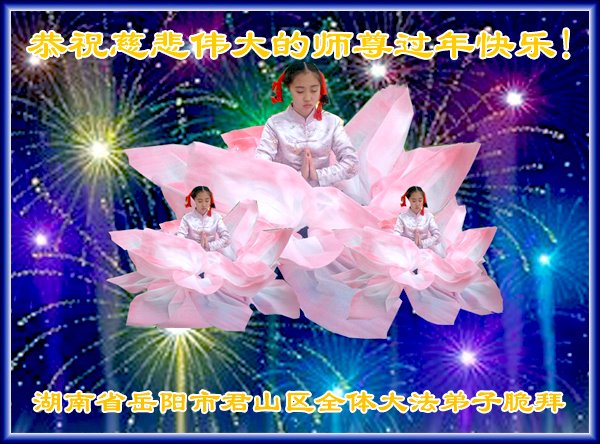 葫芦岛连山区农村大法弟子拜师尊!恭祝师父过年好!新年快乐! 在辞旧迎新之际,赋诗一首敬献师尊: 五千年大戏众神上演, 二十年正法宇宙巨变。 众生觉醒弟子了愿, 看红潮解体,法正人间。 回想弟子的一关一难, 没有师父慈悲保护怎能如愿! 没有师父慈悲保护怎能闯过大关大难! 浴火重生,凤凰涅槃, 造就新宇宙大觉之过程见证师父的法力无边。 新年伊始,阳光灿烂。 弟子围坐在师尊的法像前,敬上九炷香,泪水已连连。 弟子多想飞到大洋的彼岸,见上师父一面, 共度除夕的夜晚,共享新年的午餐。 无尽的喜悦,欢快容颜,心中的话儿说不完。 给师父三叩首,惟愿师尊节日快乐!飞到大洋彼岸! 火炼金刚二十年 血雨腥风苦中甜 救度众生师保护 浴火重生过千关 人心观念非自我 助师正法了前愿 修炼路上找自己 人海茫茫救有缘 湖南省岳阳市君山区全体大法弟子恭祝慈悲伟大的师尊过年快乐!