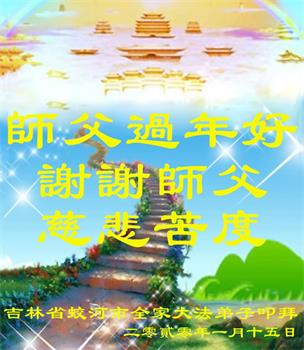 吉林省吉林市蛟河市一大法弟子代表家人恭祝慈悲伟大的师父新年快乐!