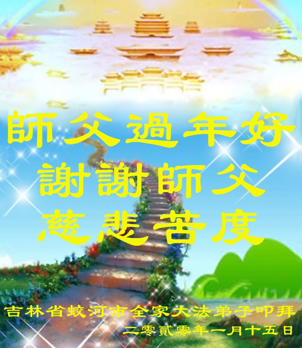 吉林省舒兰市全体大法弟子感谢慈悲伟大的师父救度之恩,弟子一定在今后珍贵的时间里,勇猛精進,助师救度众生。 在此全体舒兰市大法弟子恭祝师父庚子年新年快乐! 吉林大法弟子一家恭祝师父新年快乐!