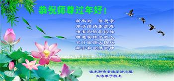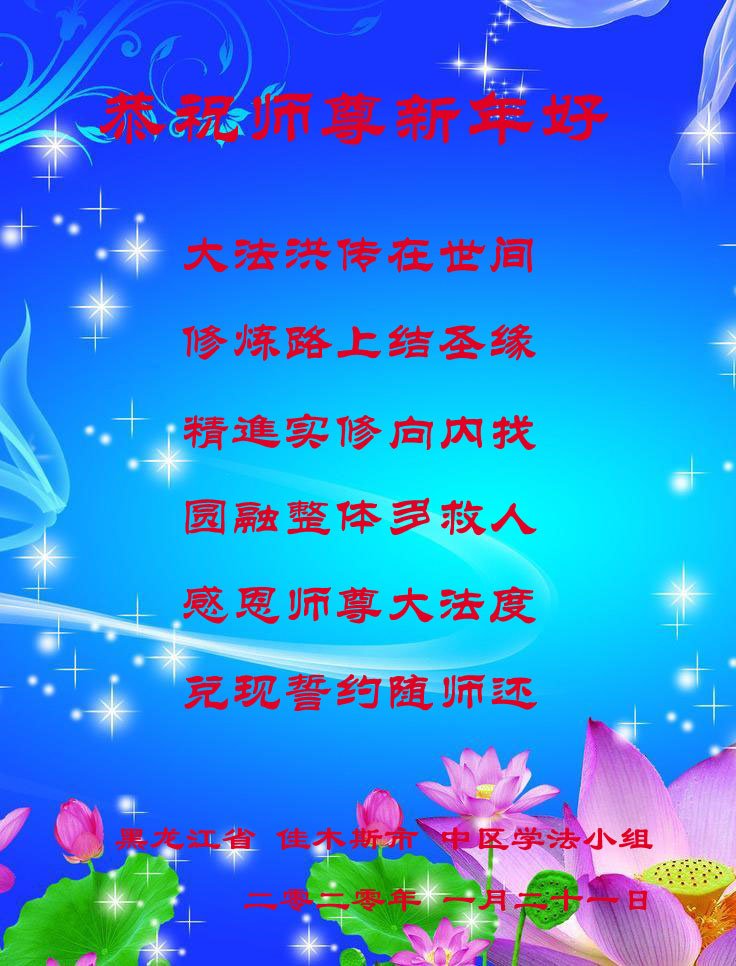 恭祝师尊新年快乐! 弟子们无法用语言感谢师尊,只能多学法,多去人心,修好自己,回报师恩。 黑龙江省佳木斯郊区部份弟子恭祝师尊新年快乐!