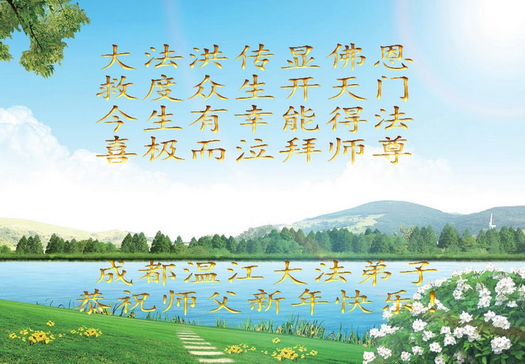 大法洪传显佛恩 救度众生开天门 今生有幸能得法 喜极而泣拜师尊 成都温江大法弟子敬上 四川省成都市一大法弟子恭祝慈悲伟大的师尊新年好!
