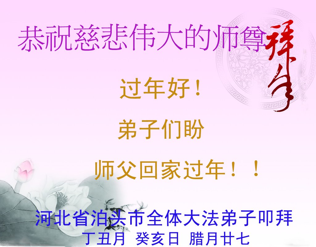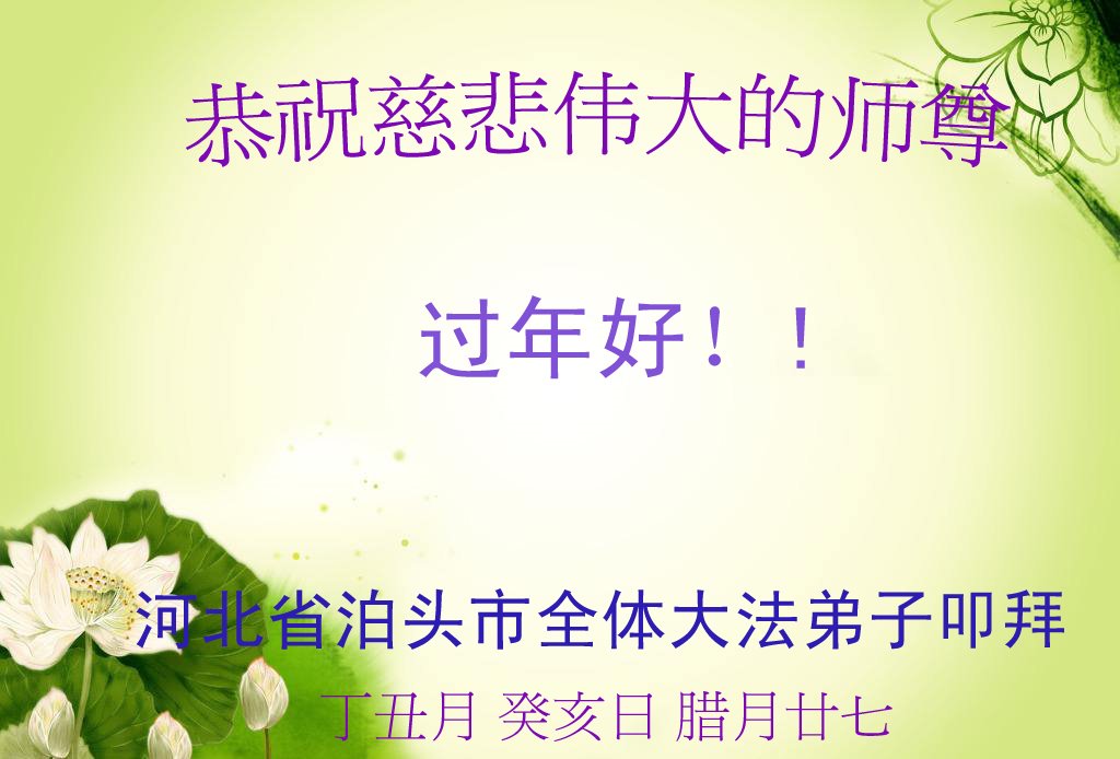 在新的一年里,弟子谨记师父教诲助师正法,救度更多众生完成师父交给的大愿,圆满随师还。 河北衡水安平城西大法弟子敬上 河北省沧州市泊头市全体大法弟子恭祝慈悲伟大的师尊过年好!