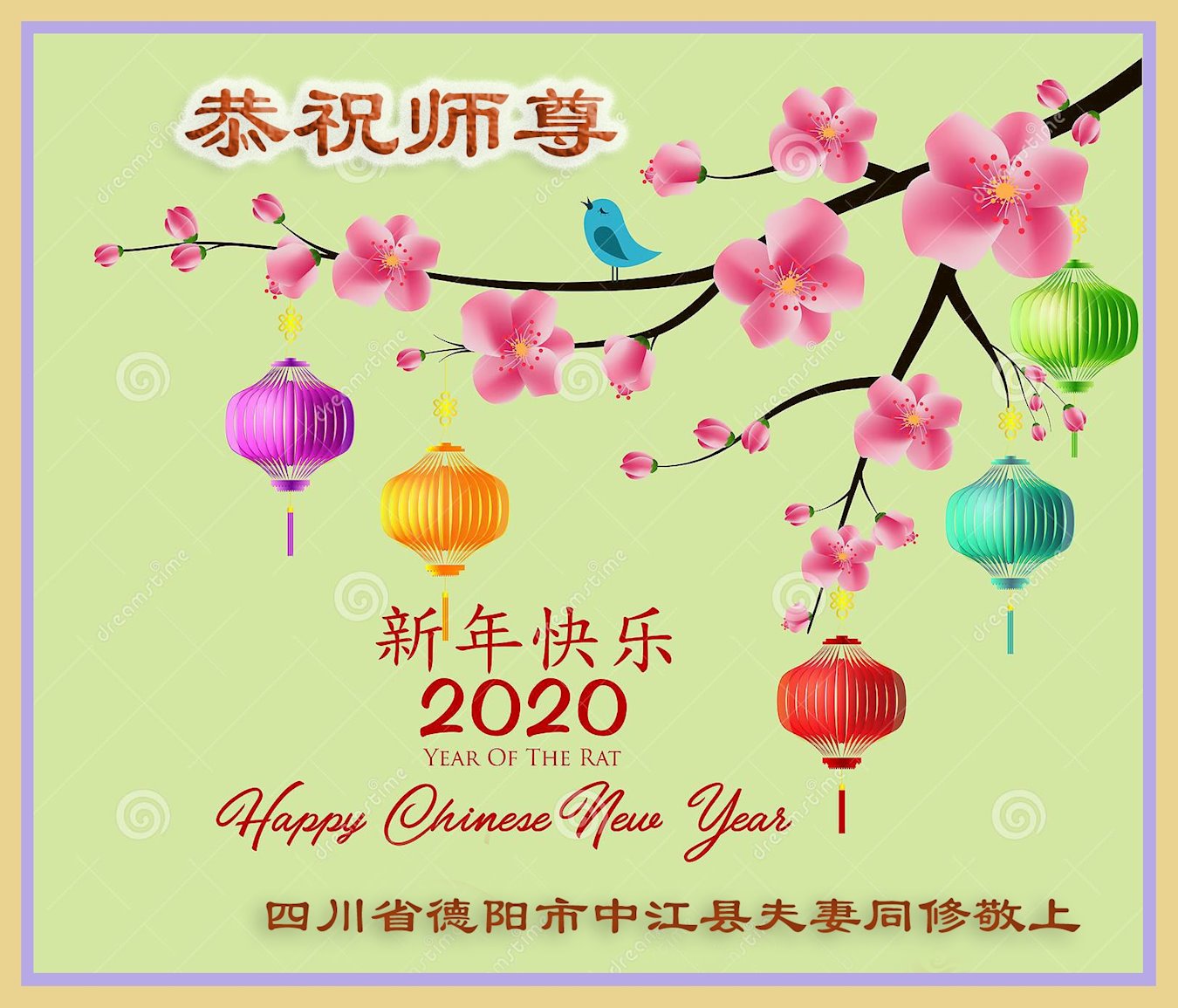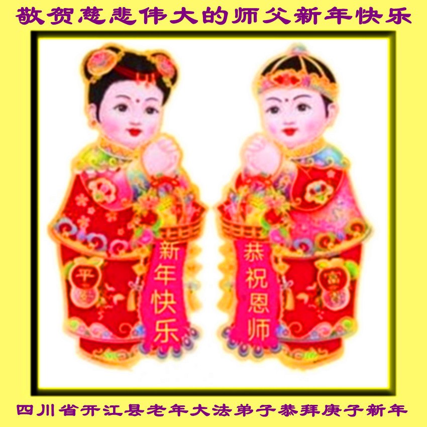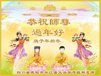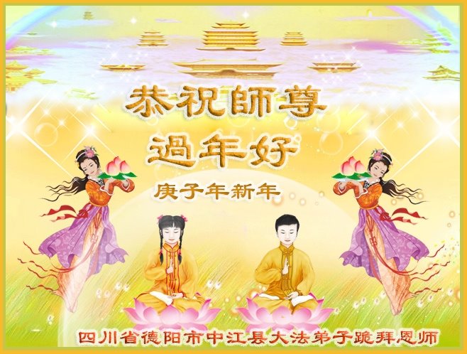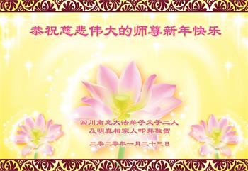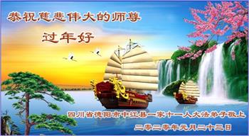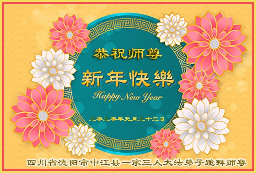 我们一家都是您的弟子,在您和大法的慈悲保护下,走过了二十三年的修炼,虽然经历了曲折、痛苦,但是魔炼出了我对师父和大法的坚信和坚定。 在此我们叩拜师尊,愿师父过年好! 四川大法弟子 二零二零年-月二十三日 四川省乐山市一学法小组全体大法弟子恭祝师尊新年快乐!