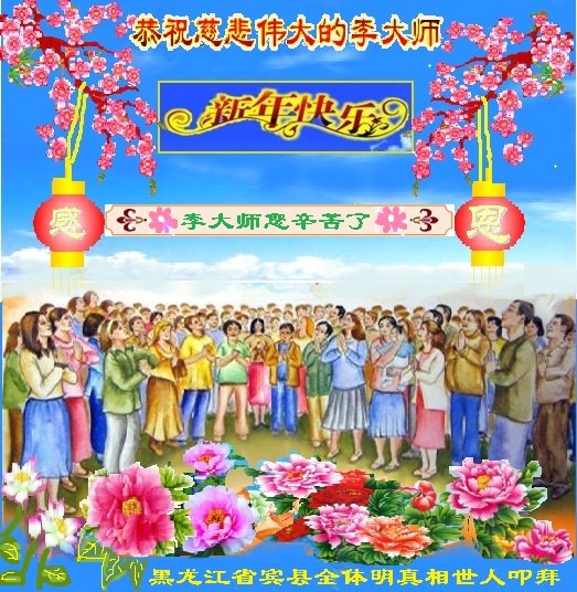 也代表明真相的世人给师尊拜年!师尊过年好! 法轮大法好!真善忍好! 弟子们在新的一年里要更加勇猛精進,相互配合,听师父话做好三件事,救度世人圆满随师父回家。 感恩师尊慈悲救度!弟子叩拜师尊谢师恩! 黑龙江省哈尔滨市宾县所有明真相的世人恭祝慈悲伟大李大师新年快乐!