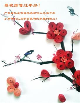 二零二零年会是个极不平凡的年代。最重要的事情是:尽早结束对法轮大法的迫害,尽早给慈悲伟大的法轮大法师尊恢复名誉,人类才会有美好的未来可言!在新年来临之际,远隔万里的中国大陆大法弟子倍感思念与深切感恩,敬仰慈悲伟大师尊的宽大胸襟,一再给世人反省自身的机会以及给修心向善的大法弟子创造优越的环境,不落下一个大法弟子最终返回天国世界的初衷!师尊您辛苦了!大法弟子由衷的感恩师尊的慈悲救度!大法弟子有信心把自己修成一个无私无我更高境界的生命,不枉来世一趟!正法的道路越走越宽畅,善良的人们已经看到了未来的希望以及那种喜悦心情的不言而喻!中国大陆的大法弟子再次恭祝慈悲伟大的师尊新年快乐! 中国大陆大法弟子敬上叩拜! 广东省汕尾市海丰县部份大法弟子和小弟子们以及明白真相的家属们恭祝师尊过年好!