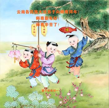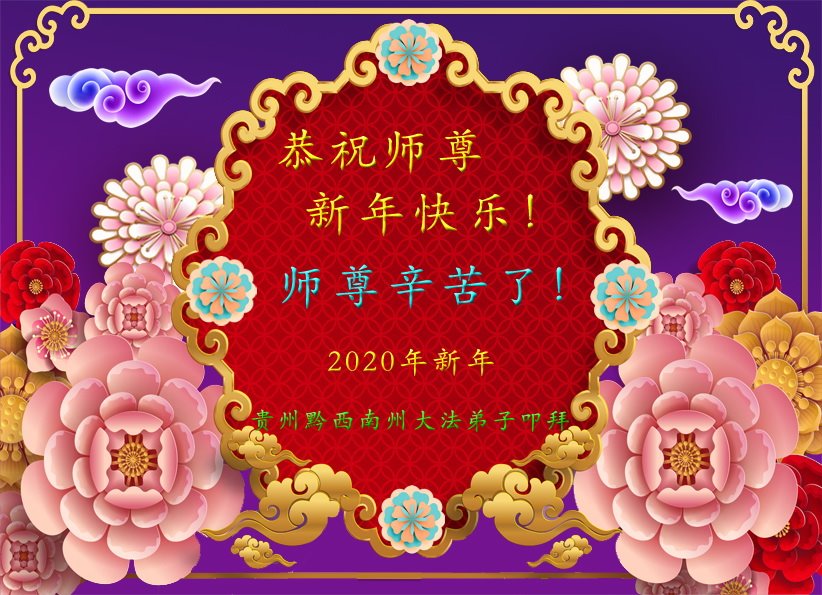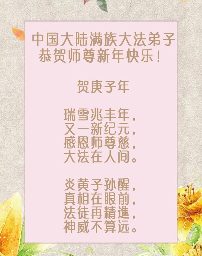 | 【明慧网二零二零年一月二十六日】(明慧网通讯员综合报道)中国大陆各民族大法弟子恭祝师尊新年好!法轮大法传遍中国大陆城市、乡村、山区、平原,各民族聚居地。各民族在历史、文化、传统、习俗、语言等方面虽各不相同,法轮大法超越了一切地域和民族的差异,佛光普照大地。 宁夏回族自治区宁南山区固原市隆德县大法弟子在贺信中说:我们虽然是边远山区,但是处处都是我们助师正法的地方,我们知道师父时时都在我们身边看护着我们。 贵州西部彝族大法弟子在这辞旧迎新的大年来临之际恭祝慈悲伟大的师尊过年好!他们在贺信中说: 今生得法上归途 感恩泪奔如雨注 世间万物不稀罕 有师有法永世福 甘肃甘南藏族自治州大法弟子恭祝师尊新年快乐!一定不辜负师父的教诲,请师父放心。 居住在北京的多位少数民族大法弟子共同发来贺信:感恩师尊在茫茫人海找到我们,把我们捞起洗净,为我们承受了那么多我们永远都不会知道的巨关巨难。我们要听师尊的话,把“真善忍”的种子播撒到万户千家。 云南省西双版纳州景洪市全体大法弟子恭祝师父过年好!中国大陆全体朝鲜族大法弟子向恩师叩拜恭贺师尊过年好!四川凉山彝族自治州全体大法弟子恭祝慈悲伟大的师尊新年快乐!内蒙古莫旗奎勒河镇大法弟子敬祝恩师新年快乐!吉林省延边朝鲜族自治州大法弟子恭祝师父过年好!吉林省延边州大法弟子敬上 吉林省吉林市全体朝鲜族大法弟子向慈悲伟大的师尊拜年!宁夏回族自治区青铜峡市大法弟子给师父拜年!恭祝师父新年好!贵州西部彝族大法弟子在这辞旧迎新的大年来临之际恭祝慈悲伟大的师尊过年好!慈悲伟大的师尊辛苦了!万幸今生得法修炼,弟子让师尊操心了。万分感恩师尊! 前世今生 不知前世我是谁 万幸今生做法徒 不知前世从哪来 今生得法上归途 不知曾造几多业 恩师化解又苦度 地狱捞洗删除名 感恩泪奔如雨注 世间万物不稀罕 有师有法永世福 北京少数民族大法弟子恭祝师尊新年好!北京少数民族大法弟子恭祝师尊新年好! 感恩师尊在茫茫人海找到我们,把我们捞起洗净,为我们承受了那么多我们永远都不会知道的巨关巨难,我们的生命是师尊给的,我们要用生命供养师尊,听师尊的话,把真善忍的种子播撒到万户千家,告诉世人“法轮大法好”。狂风挡不住我们前行的脚步,暴雨拦不住我们坚实的步伐,做好三件事,跟师尊回家。 北京少数民族大法弟子 跪拜 内蒙古全体蒙古族大法弟子恭祝慈悲伟大的师尊过年好!中国传统的新年快到了,慈悲伟大的师尊,蒙古族众法徒们过新年时,首先敬拜伟大的师尊,遥祝师尊过年好! 正法形势在突飞猛進,有待被救度的众生需要我们尽全力把大法的真相讲给他们,我们会用各自的能力、条件,用心做好该做的。慈悲的师父,众法徒们把节日的问候敬献给您,师尊您辛苦了! 弟子们叩首合十 2020年1月16日 吉林省延边朝鲜族一家4名大法弟子恭祝慈悲伟大的师尊新年快乐!吉林省延边朝鲜族3名大法弟子恭祝慈悲伟大的师尊新年快乐!师尊从地狱把弟子们捞起,又慈悲保护,使弟子们能够走到今天,无法用语言表达对师尊的感恩!所剩不多的时间里,弟子们学好法,做好三件事,紧随师尊回家! 谢谢师尊! 延边朝鲜族学法小组三名弟子恭祝师尊新年快乐!朝鲜族姐妹大法弟子及家人恭祝师尊过年好!叩拜恩师! 中国大陆满族大法弟子恭贺师尊新年快乐!贺庚子年 瑞雪兆丰年, 又一新纪元, 感恩师尊慈, 大法在人间。 炎黄子孙醒, 真相在眼前, 法徒再精進, 神威不算远。 内蒙古赤峰市蒙古族大法弟子携全家恭祝师尊过年好!慈悲的师父过年好! 弟子怀着敬仰的心,遥祝师尊过年好!弟子铭记着自己的使命,遵循着师尊的教诲。在修炼的路上凭着对大法对师父的正信,在向天国世界迈進。 师父将我从地狱中捞起净化,给我指明了通向天国的光明正道,感恩师父的洪大慈悲,感恩师父佛恩浩荡、佛光普照! 赤峰市一蒙古族大法弟子携全家给师尊叩首跪拜 合十 宁夏回族自治区全体大法弟子恭祝慈悲伟大的师尊过年好!感谢师尊慈悲救度众生!师尊辛苦了!谢谢师尊! 我们将尽全力助师正法,多救人,完成使命,走好最后的路,跟师父回家。 宁夏全体大法弟子叩拜 贵州省黔西南布依族苗族自治州全体大法弟子恭祝慈悲伟大的师尊新年快乐!贵州省黔东南苗族侗族自治州全体大法弟子恭祝慈悲伟大的师尊新年快乐!辽宁沈阳市皇姑区一朝鲜族大法弟子恭祝慈悲伟大的师尊新年快乐!吉林省延边朝鲜族自治州朝阳川镇一老年大法弟子携儿子、儿媳、姑娘、姑爷、孙子、孙女、祝慈悲伟大的师尊新年好!吉林省延边朝鲜族自治州朝阳川镇全体大法弟子叩拜师尊祝慈悲伟大的师尊过年好!弟子们在新的一年里,一定会更加精進,不忘师恩,不辱使命。 云南各民族大法弟子向师尊拜年!新宾一朝鲜族大法弟子给师父拜年!甘肃甘南藏族自治州大法弟子恭祝师尊新年快乐!代表甘南藏族自治州全体大法弟子以及在看守所和流离失所的大法弟子恭祝师尊新年快乐!我们定不会辜负师父的教诲,请师父放心。 四川省凉山彝族自治州西昌市一学法组的大法弟子们祝师尊新年快乐!弟子们在新的一年里一定做好师尊要求的三件事,请师尊放心。 四川省凉山彝族自治州全体大法弟子恭祝师父新年快乐!吉林延边朝鲜族自治州大法弟子恭贺师尊新年快乐!我是