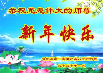 黑龙江省哈尔滨市祖孙三代大法弟子恭祝师尊新年好!