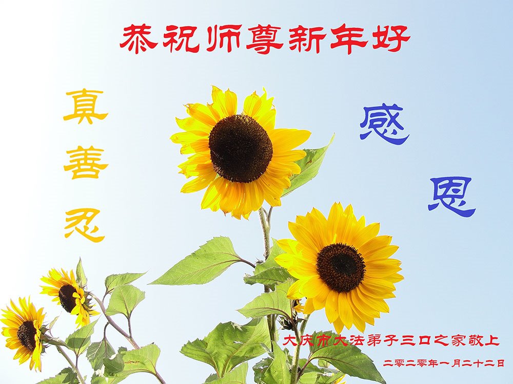 转眼又一年,师尊辛苦了!感谢师尊把这万古难遇的高德大法在这末世关键时刻捧给了我们,通过修炼,变成了一个高尚的人。为我们能返回来时的家园师尊看护我们、点悟我们,为弟子们承受着业力。我们无法用语言表达,我们永远也报答不了师恩。师尊为了我们能达到回归的标准,一再延续结束的时间。在这值千金、值万金的时刻,谨遵师尊的教诲,兑现使命,救人,完成史前大愿。叩拜师尊! 黑龙江大庆市一家大法弟子恭祝慈悲伟大的师尊新年快乐!