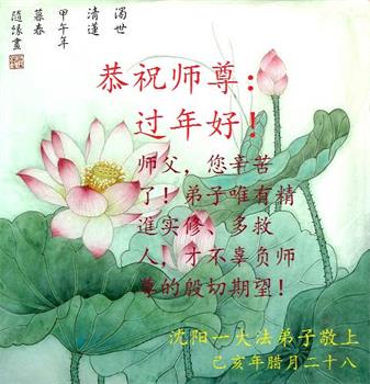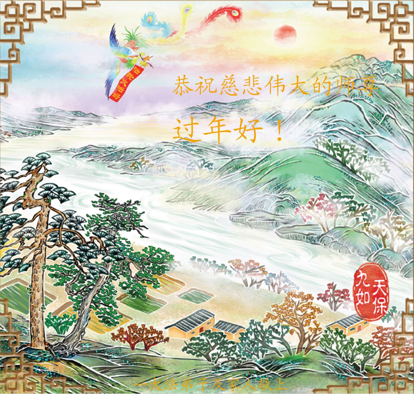 恭祝师父新年好!弟子在有限的时间里一定精進再精進,多救人兑现誓约! 辽宁省朝阳市一夫妻大法弟子敬上 辽宁省沈阳市一家五名大法弟子恭祝师尊新年好!