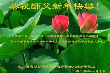 | 【明慧网二零二零年一月二十七日】(明慧网通讯员综合报道)法轮大法是性命双修的功法,真修弟子见证了大法神迹,九旬老人读书不用戴花镜,七、八十岁老人无病一身轻、步履稳健如年轻人。救度众生中,很多老年大法弟子不畏风霜、慈悲讲真相,感动了世人。新年佳节,中国各地老年大法弟子深深感恩师尊,祝愿师尊新年好! 辽宁鞍山市一位大法弟子说:“我已近九十岁,如果没有师父的救度,我早就不在人世了,我幸运的得了大法。感恩师父!” 河北省泊头市大法弟子证实,周围很多老年大法弟子身体结实、精神饱满、满面红光、二十多年从没吃过一粒药片。 山东莱西市大法弟子表示:“我们都是七、八十岁的老弟子,我们每天学法、背法,堂堂正正讲真相救人。现在世人大都明白了大法真相,很多人都相信法轮大法好并做了三:退.。我们一定记住师父的话,遇事向内找修好自己,恭迎与师父团聚的一天,跟师父圆满回家!” 山东烟台招远城区一老年大法弟子敬祝师尊过年好!师尊您辛苦了! 颂师恩 师尊正法二十春 佛恩浩荡苍宇新 信师信法紧随师 烈火炼就金刚身 旧势疯狂事干绝 垂死挣扎白费心 抓紧做好三件事 分秒必争不等人 佛光普照庚子春 邪恶全灭化灰尘 众生得救上新宇 普天同庆颂师恩 湖北省宜昌市多位老年大法弟子恭祝师尊新年快乐!师父:您好!您辛苦了! 新年到来之际,宜昌市多位老年大法弟子叩拜师尊!恭祝师尊新年快乐!我们修炼的每一步,每一次的提高,每一次的心灵升华,都离不开师尊的保护,师尊的操劳。我们倍感幸福,因为我们有师父! 在魔难中,在过关中,我们哪怕是有一点点的提高,都会发自内心的谢谢师尊。没做好时,心中确实感到很愧疚,心想下次一定争取做好。我们一定会听师父的话,向内找,改变自己。不忘师尊赐予我们的神圣使命,努力做好三件事,跟师尊回到自己真正的家园。 合十 叩拜师尊 二零二零年一月十一日 四川省成都彭州市九十七岁的女大法弟子和女儿恭祝师父新年快乐!我现在九十七岁,九七年得法,修炼至今二十二年了,从修炼一直到现在学法不用眼镜,集体学法不念错字,大法在弟子身上发生了很多神奇的事。 四川省成都彭州市九十七岁的女大法弟子和女儿敬上 二零二零年一月十日 辽宁鞍山市近九十岁老年大法弟子恭祝师父过年好!新年快乐!感谢师父的救度!我已近九十岁,没有师父的救度,我早就不在人世了,我幸运的得了大法。感恩师父! 我于一九九四年得法,在师父的教导、保护下平稳的走过来了。我将继续按师父的教导,多学法、学好法,多救人,做好三件事。越到最后越精進,圆满随师还。弟子梅叩拜! 山东省青岛市莱西两个老年学法组大法弟子恭祝师父新年快乐!师父啊,我们想念您!我们都是七、八十岁的老弟子,我们每天学法、背法,堂堂正正讲真相救人。现在世人大都明白了大法真相,很多人都相信法轮大法好并做了三:退.。我们一定记师父的话,遇事向内找修好自己,恭迎与师父团聚的一天,跟师父圆满回家!问候伟大的师父过年好! 湖南省岳阳市八十二岁大法弟子携全家恭祝慈悲伟大的师尊新年快乐!感谢师父的慈悲苦度!谢谢师父的救度之恩!我们全家叩谢您! 岳阳市一老年大法弟子携全家给师尊拜年 二零二零年元月十四日 四川省绵阳市一八旬大法徒向师父拜年!在中国新年到来之际,弟子祝师尊新年快乐! 您为救天宇,救苍生,历经艰辛,无量付出。曾经,在我生命垂危之时,是您把我从地狱中捞起,洗净,给了我第二次生命。 在我二十多年的大法修炼中,不知师尊为我承受了多少!是师尊牵着我一步一步的走到今天。 我一定听师父的话,多学法、学好法,多救人,努力做好三件事,修去所有的人心与执着,争取圆满随师还。 四川省绵阳市一八旬大法徒 二零二零年一月十三日 辽宁省沈阳市沈河区一位老年大法弟子恭祝师尊新年快乐!感恩师父的慈悲苦度! 我深深的知道我的命是师父给的。以前多次救我,前几天又一次救了我。我突然发高烧,三天吃啥吐啥,我请师父帮我。我昏睡了三天三夜。醒来我就炼功,我感到身体高大无比,轻飘飘的,很快就好了,又能与同修去讲真相了。我知道是师父救了我,我无法表达对师尊的感激之情! 在此新年之际,我给师父拜个年!祝师尊新年快乐!愿师尊多一份欣慰,少一分辛劳! 沈阳沈河区一位老年大法弟子叩拜 内蒙古一老年大法弟子恭祝师父新年快乐!师父好! 首先恭贺师尊新年好!新年快乐! 在师尊慈悲保护下,风风雨雨走过二十四年,纵有千言万语也难以表达,尤其是度过几次生死攸关的关键时刻,师父,既是威严有加的恩师,又是慈悲为怀的父亲,救弟子于生死瞬间,救度大恩无以为报,不争气、让师父操心的弟子,跪拜师父,师父谢谢您!让师父操心了,让师父承担弟子生生世世的无法用语言描述的滚滚罪业。 写到这里,眼泪扑簌簌的流下来,在最后的关键时刻,弟子一定走好师父安排的路,多学法,学好法,百分之百的信师信法,将向内找的法宝发扬光大,修好自己,不负师父救度之恩。 师父度我们,我们讲真相救众生,完成史前大愿,在法上提高自己,决不辜负师父的慈悲苦度。师父,您辛苦了!最后,一定会勇猛精進,圆满随师还! 北京市丰台区一老年大法弟子恭祝慈悲伟大的师父新年好!恭祝师父新年快乐! 我想念师父。是师父一次次把我从苦难中救起,永远感谢师父。在任何环境我都听