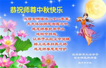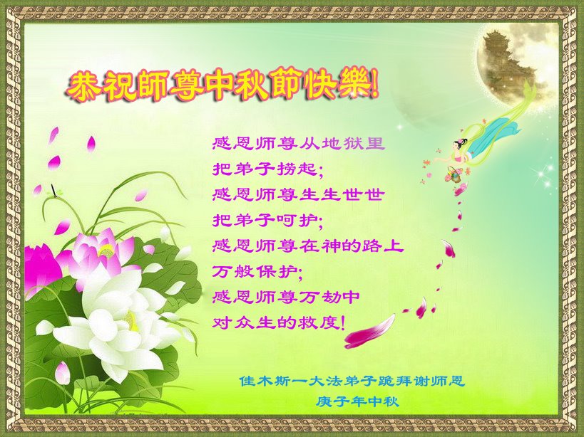 弟子及全家人都在师尊的保护下平安、顺利。在此中秋节来临之际,向伟大的师尊叩拜! 黑龙江佳木斯一学法小组大法弟子恭祝师尊中秋节快乐!