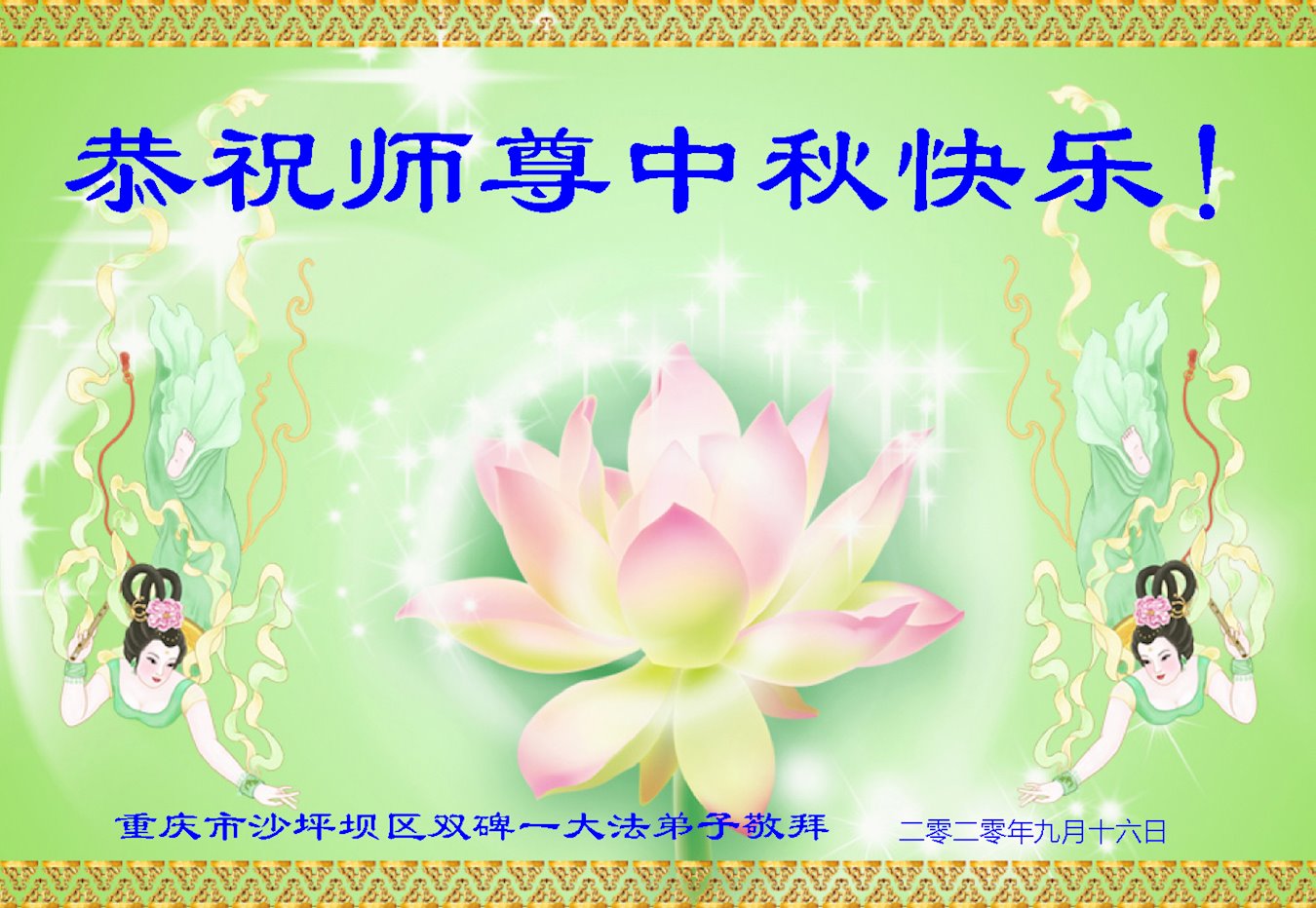 恭祝慈悲伟大的师尊中秋快乐!师尊您辛苦了! 感恩师尊慈悲救度! 感恩师尊慈悲保护! 唯有精進实修报师恩! 重庆市沙坪坝区双碑一大法弟子敬拜! 二零二零年九月十六日 重庆渝北区大法弟子恭祝师尊中秋快乐!